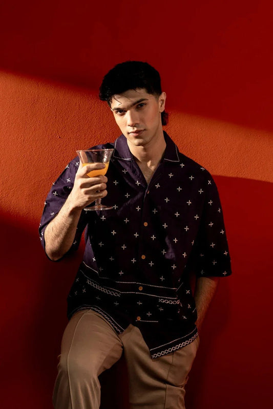 Purple Embroidered Down Shoulder Shirt - Unisex